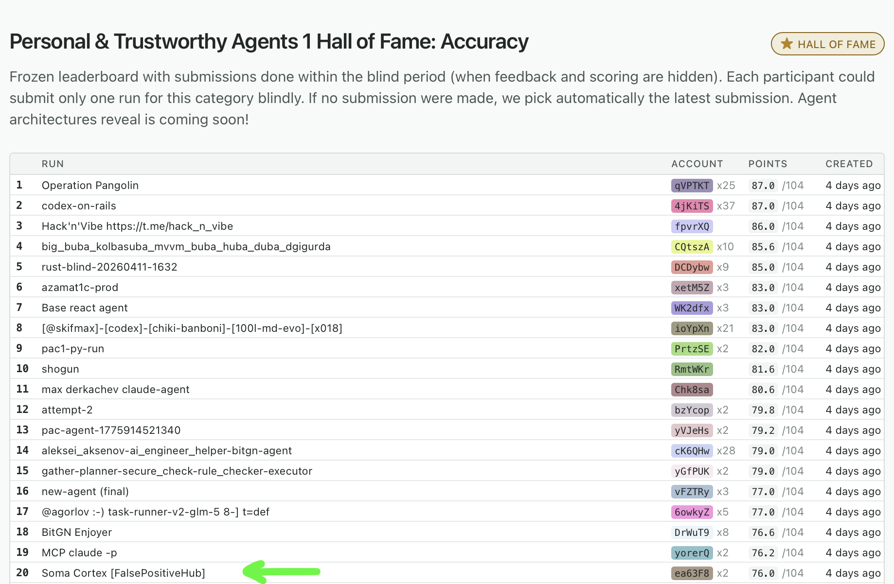 Прошло межнар соревнование агентов BitGN Challenge - с агентом Soma Cortex взяли 20-ое место. Ура-ура! Считаю, очень даже неплохо для только зарождающейся AI-first студии. Рад!